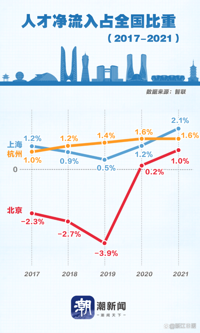 无独有偶。智联招聘推出的《中国城市人才吸引力排名:2022》(以下简称《人才报告》),基于数千万次的跨城求职数,分析得出2021年北京、上海为杭州最大人才来源城市。