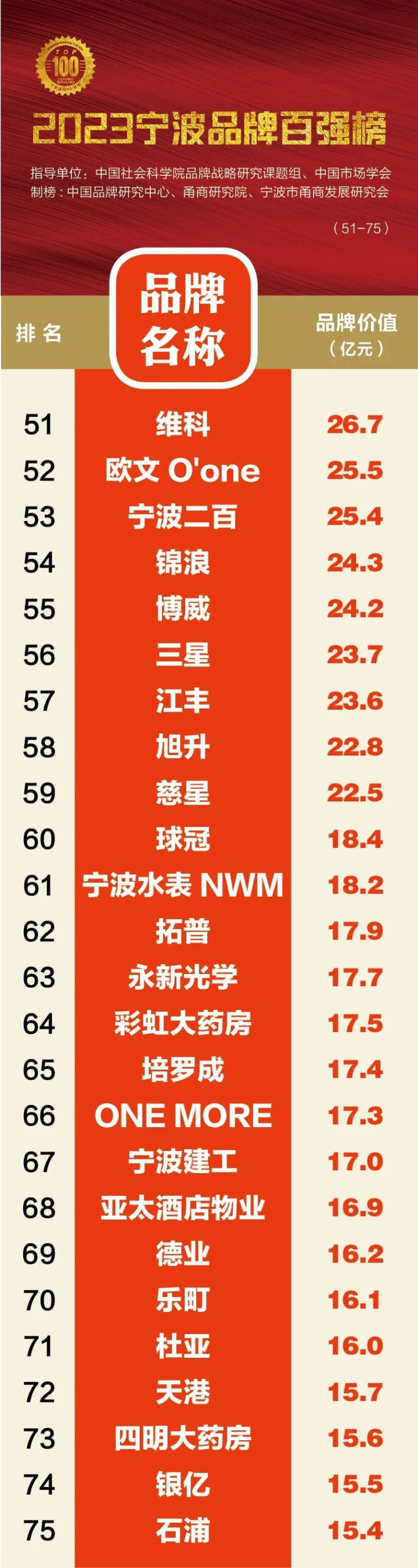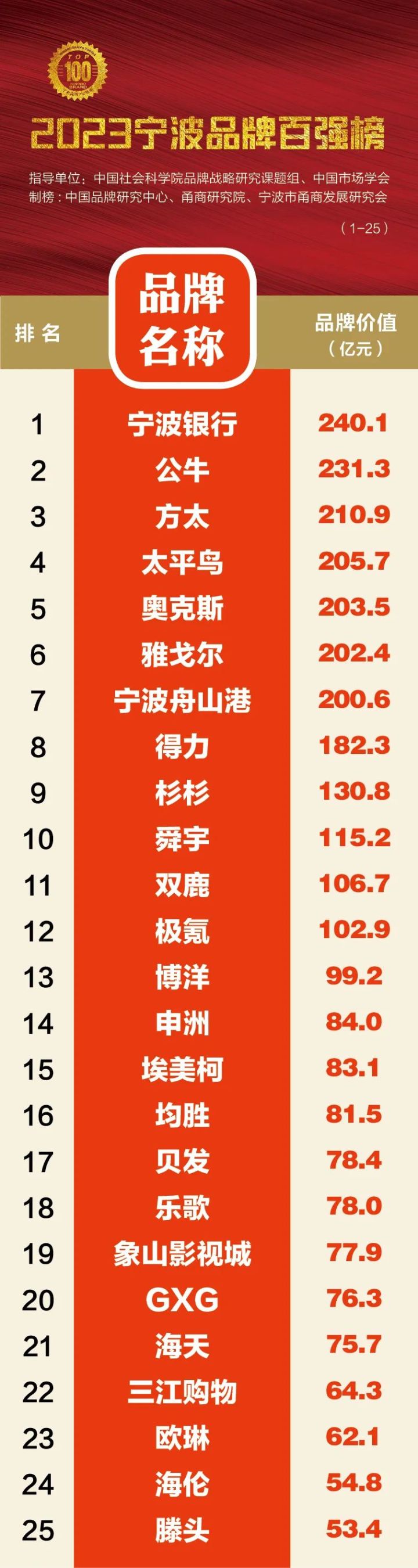 “2023宁波品牌百强榜”由宁波市甬商发展研究会牵头组织,并联合中国社科院品牌战略研究课题组和中国市场学会、中国品牌研究中心等国内权威机构,作为本次榜单的指导和共同主办单位。