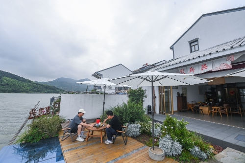 6月12日,游客在慈溪市观海卫镇双湖村的一家茶室喝茶聊天,双湖村是一个坐拥三山两湖的江南典型村落,东靠杜湖,南邻白洋湖。近年来,双湖村努力打造成为独具农文融合的古村旅游目的地。该村获得第七批中国历史文化名镇古村、浙江省美丽宜居村、浙江省美丽乡村特色精品村等荣誉。
