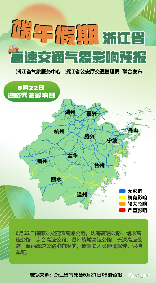 6月22日(端午节):浙南和浙中西部地区阴有阵雨或雷雨,部分中到大雨,局部暴雨;浙北北部地区多云;其它地区多云到阴部分有阵雨或雷雨。