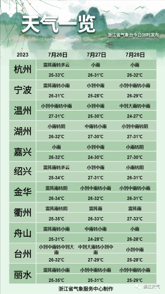 预计7月26日-28日,东海中南部海域9-11级阵风,东海北部海域和浙江沿海海面8-9级阵风。26日沿海地区部分中到大雨,局部暴雨;27-28日沿海地区中到大雨部分暴雨,其中东南沿海地区局部大暴雨。