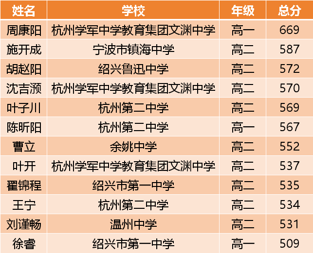 从选手单人成绩看,杭州学军中学教育集团文渊中学的周康阳以669分的成绩,拿到了金牌第一名。