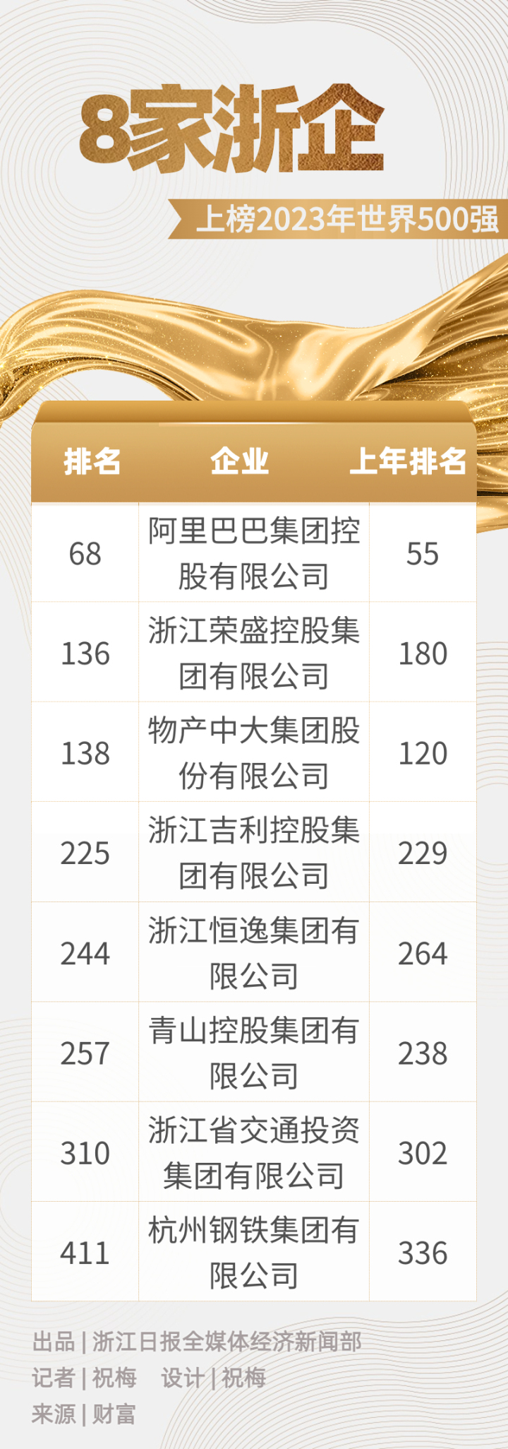 记者梳理后发现,今年共有8家浙企入围最新的世界500强榜单。去年,500强榜单中共有9家浙企,今年上榜的8家浙企都是老面孔,而去年排名第459位的海亮集团有限公司今年未能入围。