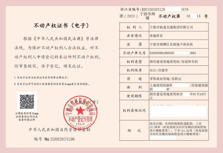 潮新闻讯 近日,宁波市海曙区不动产登记中心为宁波轨道交通集团有限公司发放了宁波地铁1号线鼓东区间地下商业综合体项目的不动产权证书,这是浙江省内首本轨道交通站点区间地下商业空间不动产权证书,也是宁波首本附有地下构建筑物所有权界限三维立体图示的不动产权证书。