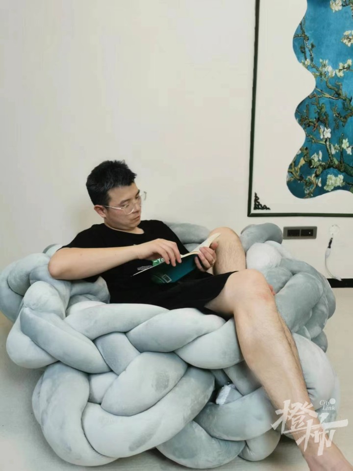 要说这其中最耗费心血的,一定是“鸟巢沙发”。这个沙发来头不小,是国外大牌设计师的设计,售价高达26万元。为了节约成本,陈卢郎把家中废弃的抱枕拆了个遍,拆出了足量的棉花,再通过一针一线纯手工缝制拼接,足足花了一个礼拜才将低配版的沙发做成,总共才花费80多元。
