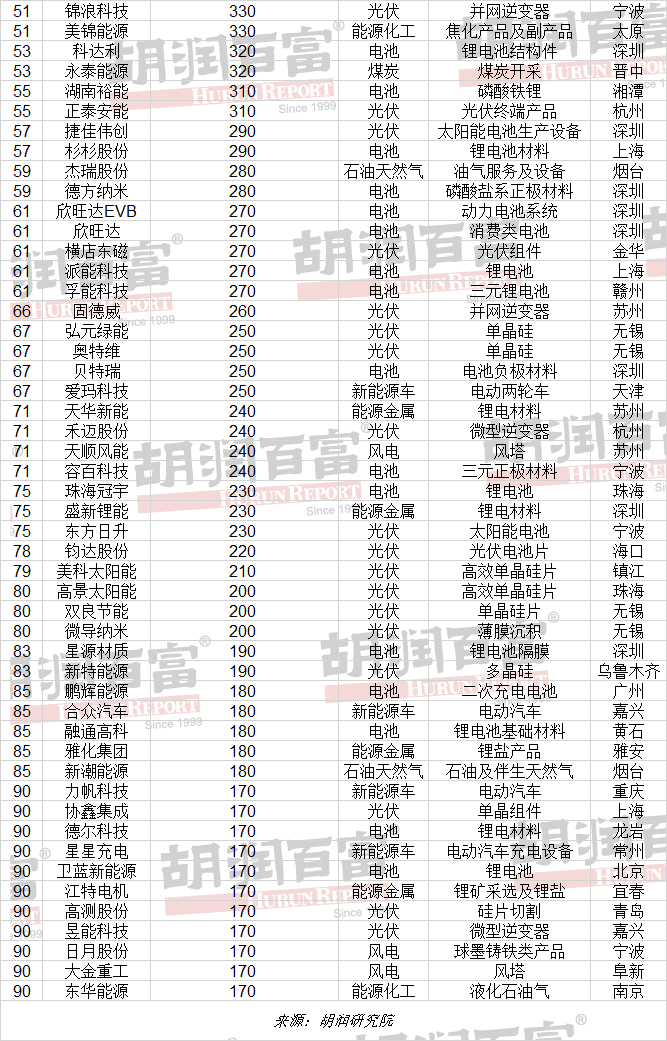 胡润提到,深圳是最善于培育能源产业民营企业的城市,有11家企业上榜。其次是4个长三角城市,无锡有7家,上海、宁波和苏州各有6家。“这几座城市的工业基础很扎实,当新能源的风口来临时,可以快速承接相关技术及产能。尤其上海,虽然特斯拉不是中国企业,不在榜单上,但一个特斯拉上海工厂对周边关联产业的带动作用是巨大的。”