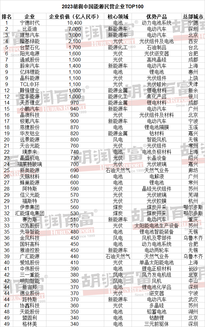 潮新闻报道 9月7日,胡润研究院发布《2023胡润中国能源民营企业TOP100》(Hurun China Most Valuable Private Energy Companies 2023),列出了传统能源与新能源产业最具价值的中国民营企业100强。这是胡润研究院首次发布该榜单。