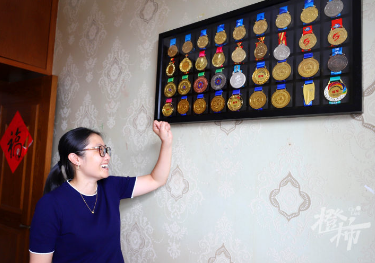 (邹佳琪妈妈亲手整理制作的奖牌框,陈列着邹佳琪这些年获得的奖牌)