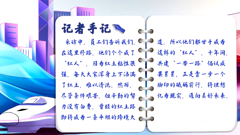 采访中,员工们告诉我们,在这里修路,他们个个成了“红人”,因为红土粘性很强,每天大家浑身上下沾满了红土,难以清洗。然而,尽管条件艰苦,但辛勤的努力没有白费,曾经的红土路即将变成一条平坦的跨境大道,所以他们都甘于成为这样的“红人”。十年间,共建“一带一路”倡议成果累累,正是靠一步一个脚印的砥砺前行,将理想化为现实,通向美好未来。