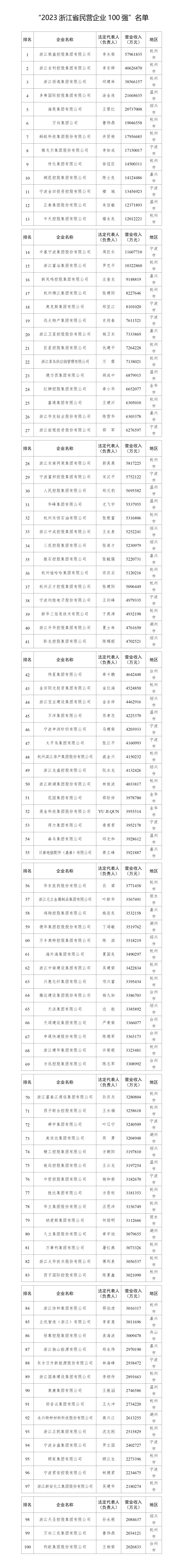 新出炉的浙江民企百强榜,根据2022年度财务报表,以企业2022年度营业收入(销售总额)为基本标准,参考其当年纳税额、净利润等指标及企业信用信息公示系统年报相关数据进行排序。