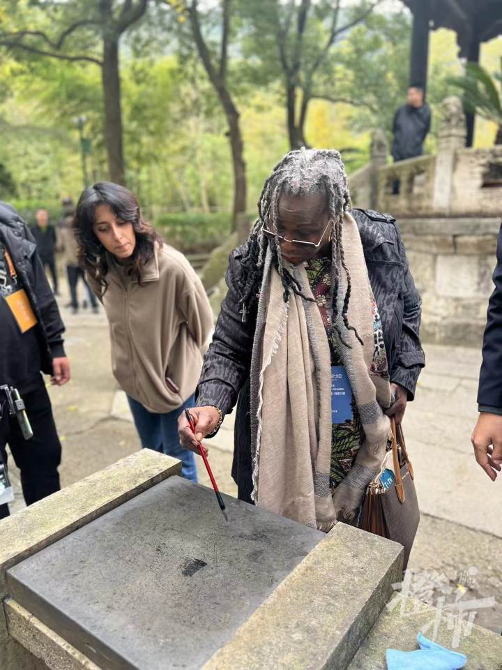 科特迪瓦艺术学院雕塑系教授Moreau Épouse Kouassi Mathilde熟练地拿起毛笔,笔尖蘸水后,在石台上写了一个“太”字。“太高兴,太好了,就是这个太对吧?”来自科特迪瓦的她,是一位中国通,她说自己有一个中文名字,叫“莫合”。几年前,她被公派到中国,在北京语言大学学习了一年汉语后进入中央美术学院学习中国画。