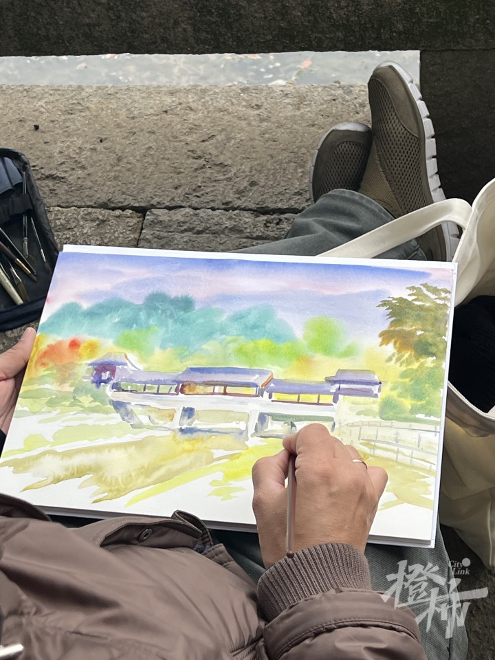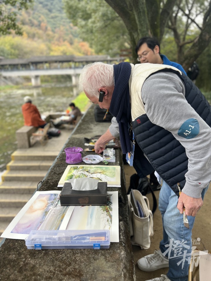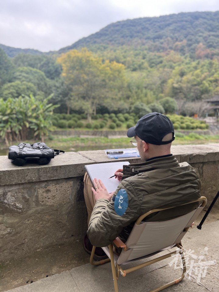 随后,外国艺术家们来到兰亭溪边,在骋怀桥头采风写生。哈萨克斯坦艺术家Nurlan Kilibayev说,这几天让他感触很深的是浙江的自然风光,“杭州、绍兴,这里的人就好像生活在一片绿意当中,到处是树,环境太优美了。”