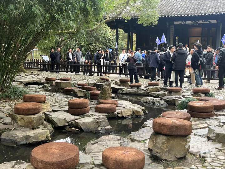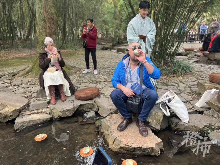1600多年后的今天,外国艺术家们也效仿中国古人模样——坐在溪水两边的蒲垫上,以茶代酒,一觞一咏,畅怀俱情。