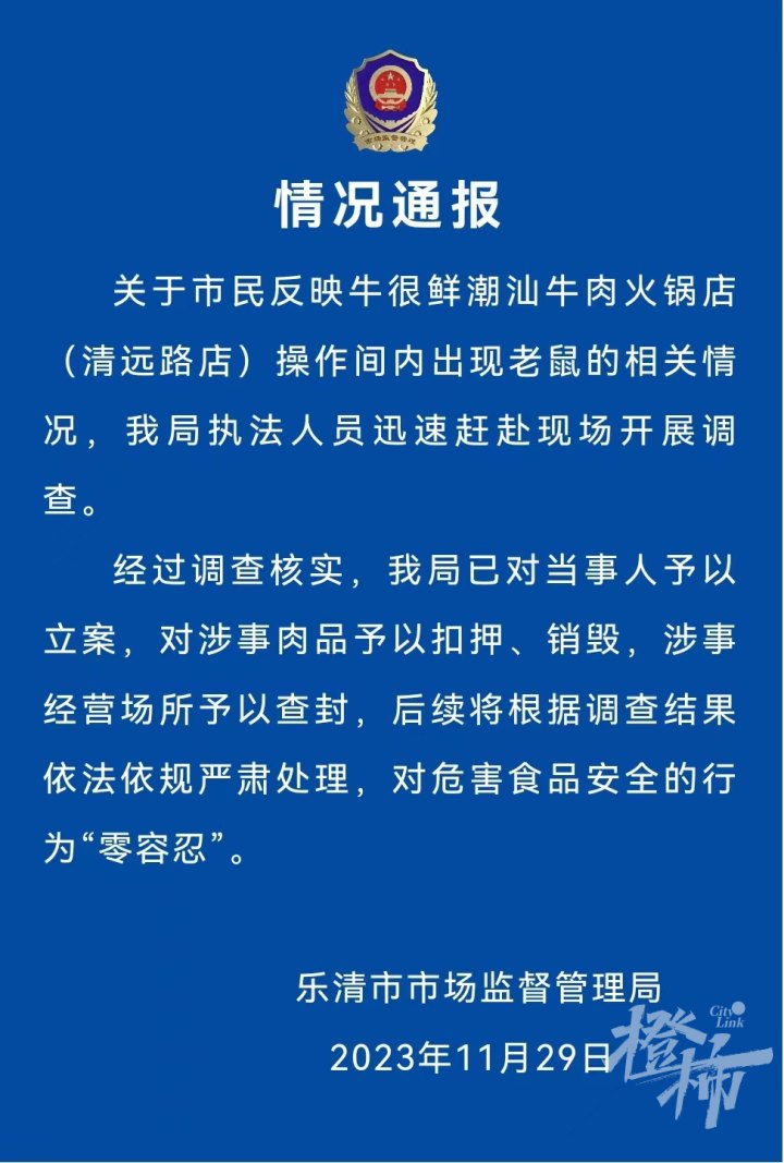 中午11时31分,乐清市市场监督管理局通过乐清市视频质量安全检测中心官方微信公众号“食药乐清”发布了情况通报:关于市民反映牛很鲜潮汕牛肉火锅店(清远路店)操作间内出现老鼠的相关情况,我局执法人员迅速赶赴现场开展调查。经过调查核实,我局已对当事人予以立案,对涉事肉品予以扣押、销毁,涉事经营场所予以查封,后续将根据调查结果依法依规严肃处理,对危害食品安全的行为“零容忍”。