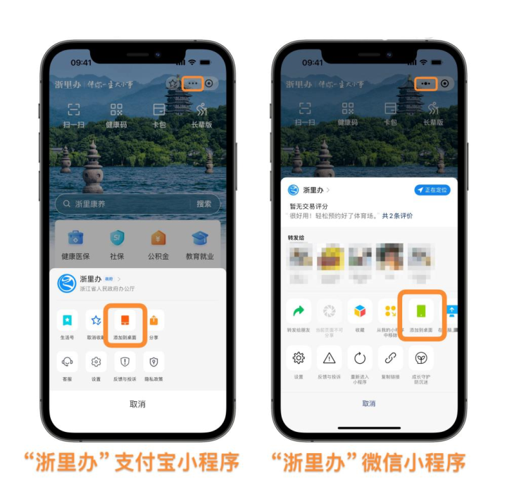 如果更习惯使用小程序来“浙里办”办事,还可以通过“浙里办”支付宝小程序或微信小程序【首页】右上角的更多按钮,把它们添加到自己的手机桌面,今后直接快捷进入即可。