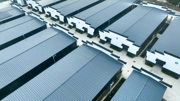 湖羊基地屋顶上方,连片的光伏板闪闪发光。共享联盟·南浔 宋豪亮 摄
