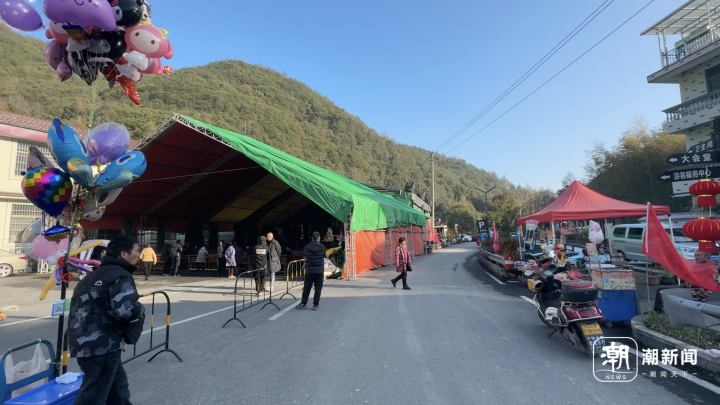 1月30日,临近中午,一辆载着音响设备、舞台道具等各式器材的小型卡车开进了金华东阳下瑶村,倒着驶入刚搭建好的巨大棚子里。章仁杰快步向前,帮着把东西往下抬。