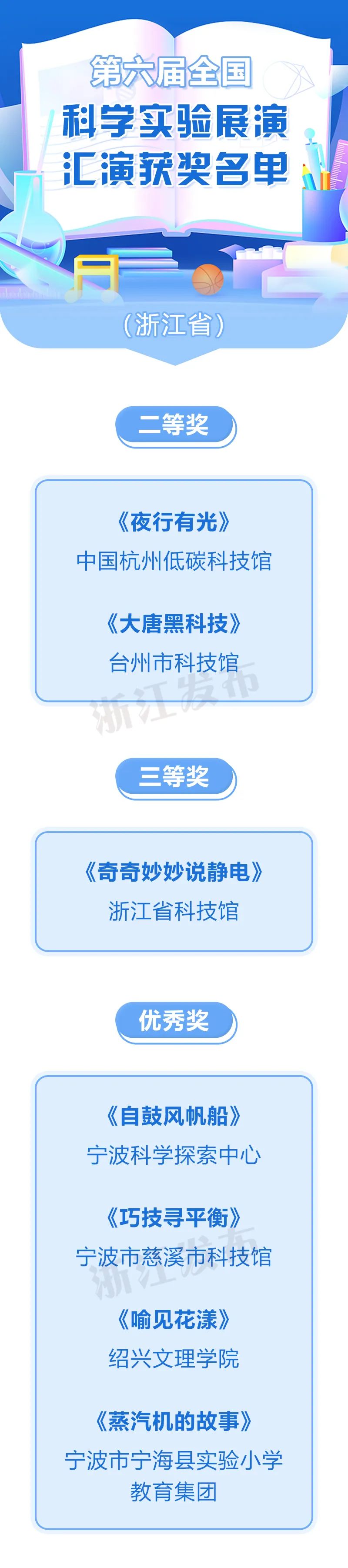 近日,科技部办公厅、中国科学院办公厅公布了第六届全国科学实验展演汇演活动获奖名单。其中,浙江2项获二等奖,1项获三等奖,4项获优秀奖。