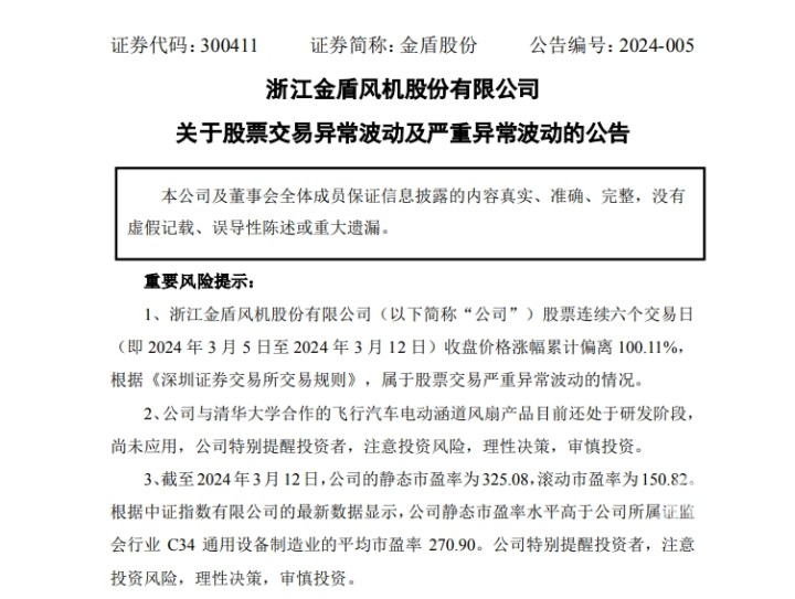 在3月股价持续拉升后,金盾股份也出具了这一风险提示公告,公司与清华大学合作的飞行汽车电动涵道风扇产品目前还处于研发阶段,尚未应用。