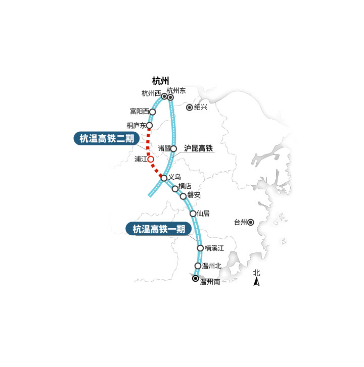 杭温高铁起于杭州市桐庐县境内的桐庐东站,向南延伸进入金华市境内,经过浦江、义乌、东阳和磐安,设有浦江站、义乌站、横店站和磐安站,之后进入台州市境内,设有仙居站。最后到达温州市境内,设有楠溪江站、温州北站和温州南站,全长260公里,设计时速350公里,建成后是连接杭州与温州“最快”的高铁线路。