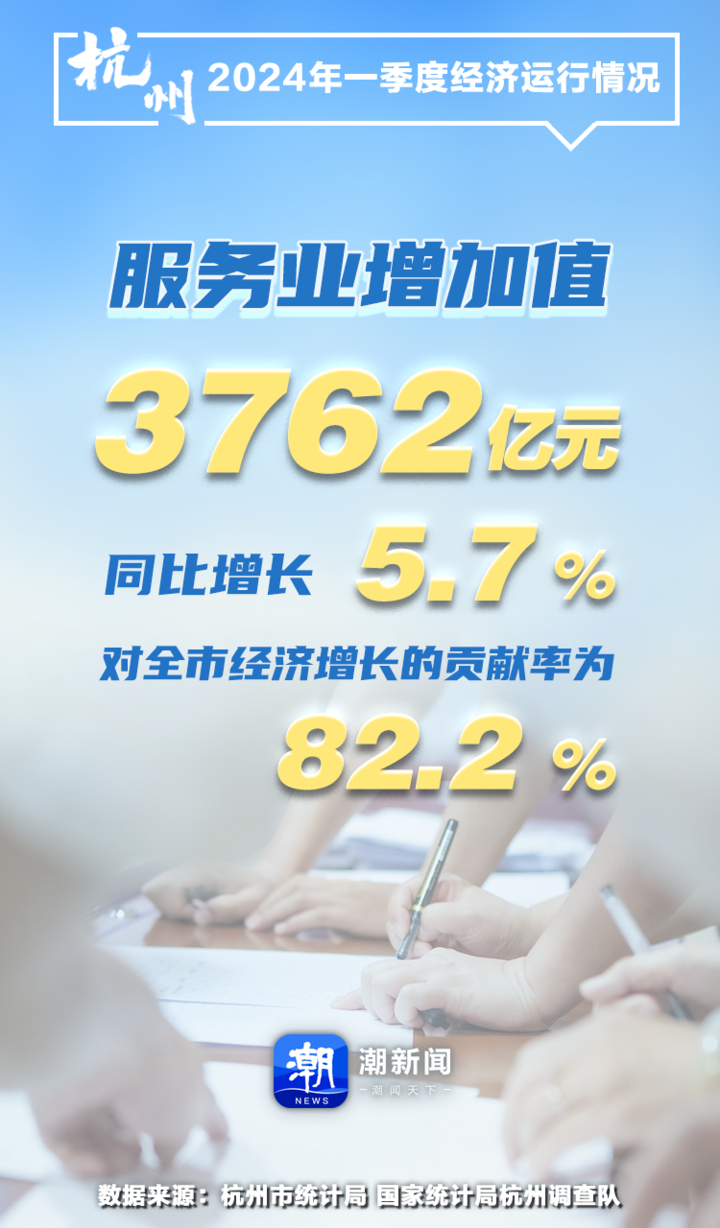 一季度,杭州服务业增加值3762亿元,同比增长5.7%。值得一提的是,服务业对经济增长的贡献率达82.2%。