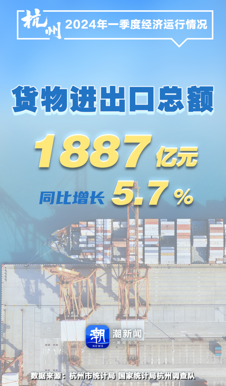 一季度,杭州货物进出口总额1887亿元,同比增长5.7%。其中,出口1226亿元。