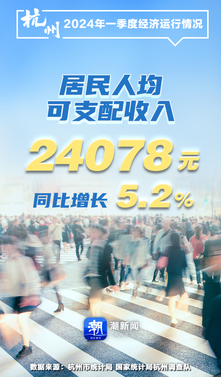 一季度,杭州居民人均可支配收入24078元,同比增长5.2%,基本与GDP增速同步。