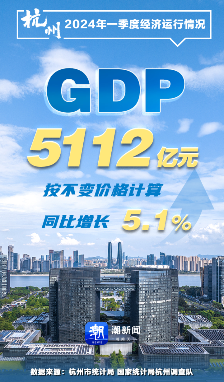 4月23日,记者从杭州市统计局和国家统计局杭州调查队获悉,根据统一核算结果,今年一季度杭州生产总值(GDP)5112亿元,按不变价格计算,同比增长5.1%。