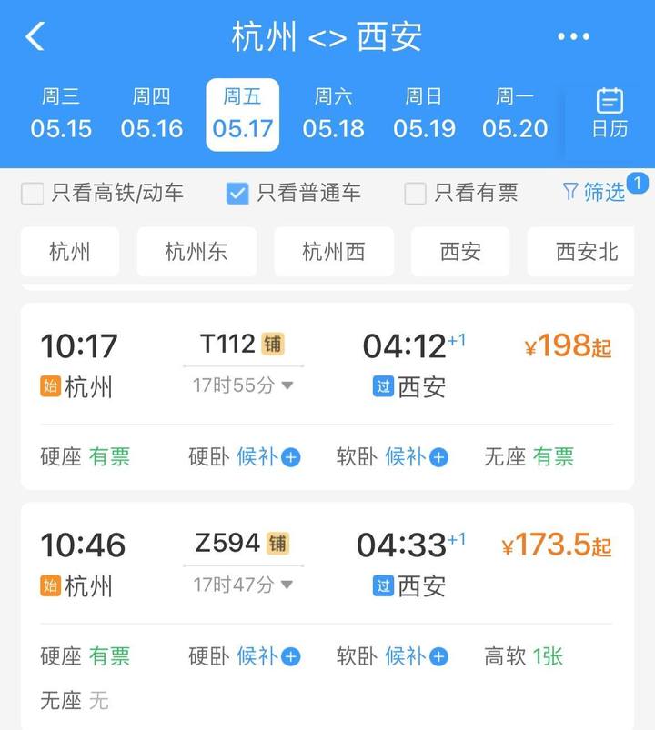 五一抢票期间,高铁票难抢屡上热搜。但不少网友发现,在抢票软件上,绿皮火车票也是“开票即候补”。节后,记者随机在铁路12306App上搜索几班普速列车,发现从周五开始列车的软卧、硬卧都显示“候补”状态。