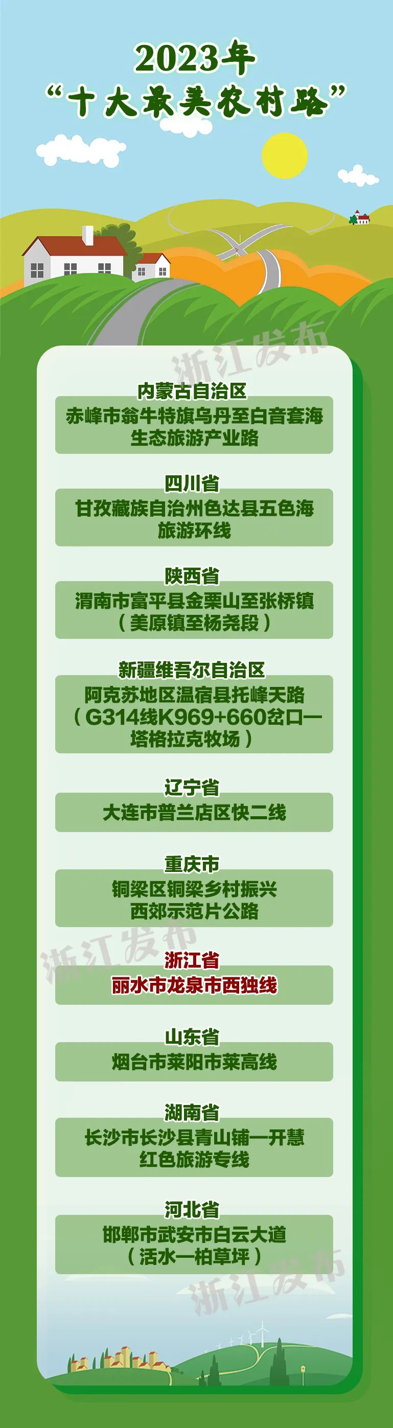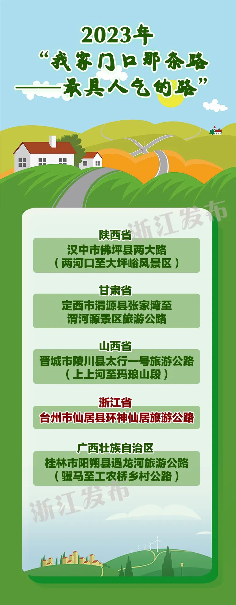 交通运输部办公厅近日公布了2023年“十大最美农村路”和2023年“我家门口那条路——最具人气的路”名单,其中浙江的丽水市龙泉市西独线入选2023年“十大最美农村路”、台州市仙居县环神仙居旅游公路为2023年“我家门口那条路——最具人气的路”。