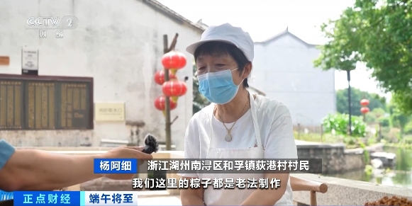 浙江湖州南浔区和孚镇荻港村村民 杨阿细:我们这里的粽子都是老法制作,不用高压锅,味道特别好,外地的游客特别喜欢,都到我们这里来买。
