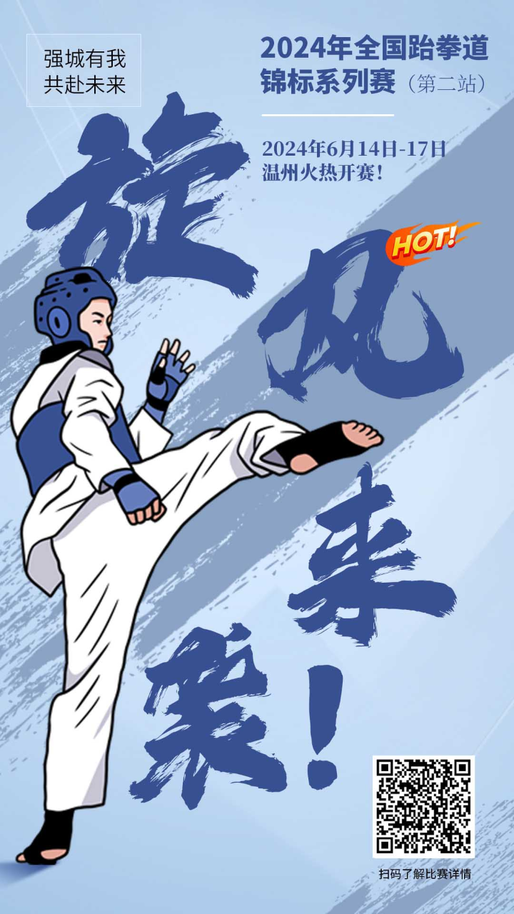 温州网6月8日讯 温州又将迎来一场国字号赛事。6月14日-6月17日期间,2024年全国跆拳道锦标系列赛(第二站)将在温州奥体中心体育馆精彩上演。来自全国30多支代表队的859人将齐聚温州,上演最高水平的对决。
