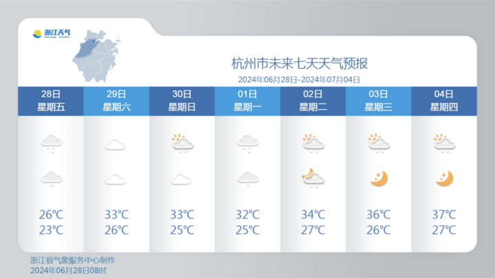 4日起副热带高压加强控制我省,我省将以晴热高温天气为主,午后有分散性雷阵雨。尤其4-5日杭州、嘉兴、丽水等地最高气温或将直冲37℃!这是要出梅的节奏吗?我们静待官宣。