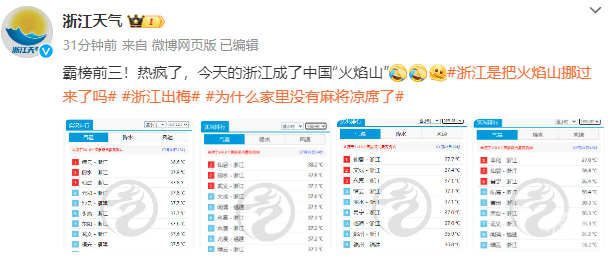 今天浙江选手表现尤其突出,截至下午3点,几乎霸榜全国气温榜前三,连浙江天气也说:热疯了,今天的浙江成了中国“火焰山”。