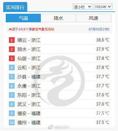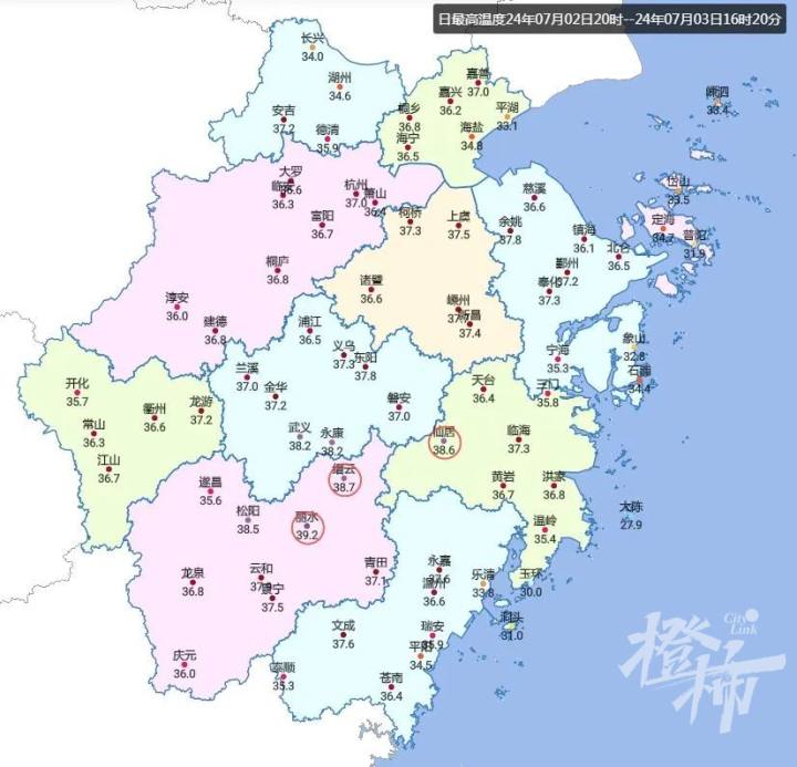 截至下午4点20分,今日全省最高气温前三甲均出现在浙南一带。丽水:39.2℃,缙云:38.7℃,仙居:38.6℃。