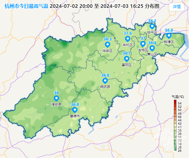 杭州今天的最高气温也超越了昨天,冲上了37℃,也再次刷新了今年气温的新高。