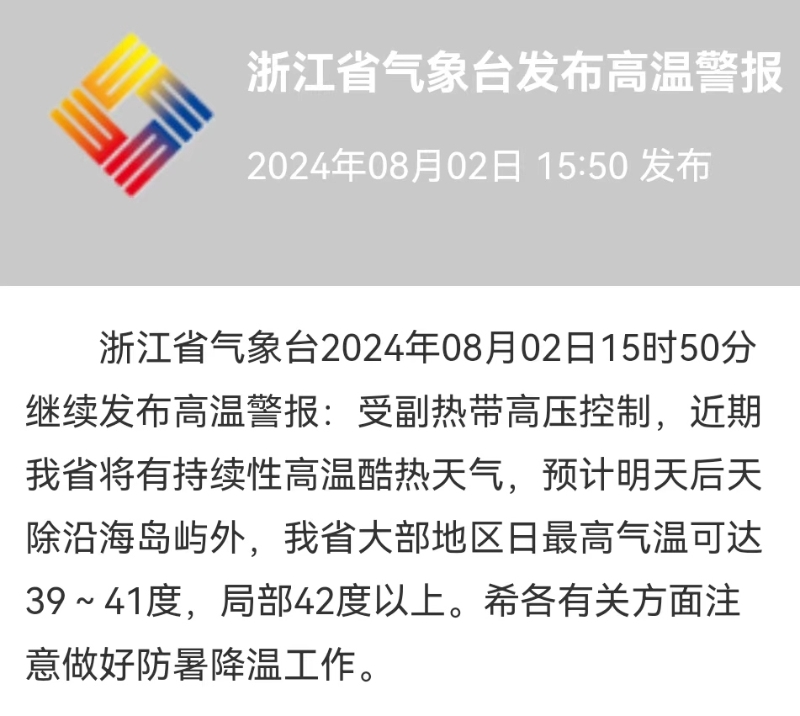 城市方面,温州39.6℃、普陀37.6℃破了8月上旬最高气温纪录,杭州40.9℃再次刷新了今年以来的新高。