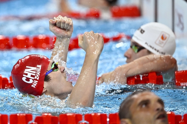 潘展乐(中)在夺冠后庆祝。 新华社记者 王鹏 摄