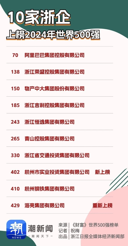 8月5日,《财富》发布2024年世界500强榜单。涌金君梳理统计,今年共有10家浙企入围榜单,上榜企业总数较去年增加2位。