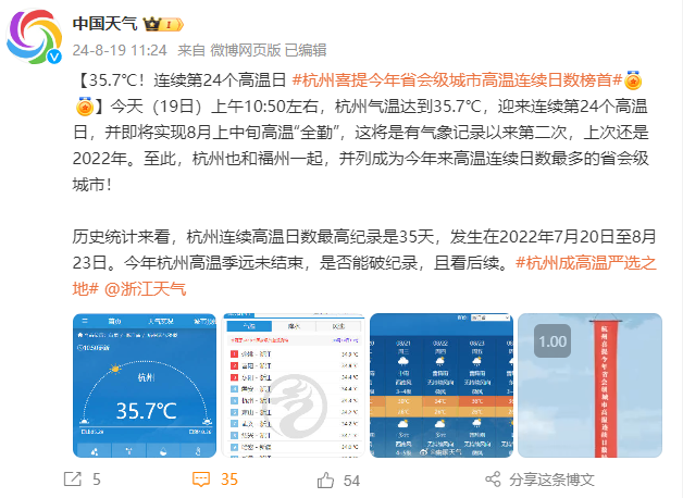 昨天(8月19日),杭州被高温硬控超过4个小时,最高气温一度达到37.7℃。至此,这波高温已持续24天,追平福州,并列成为今年以来高温连续日数最多的省会级城市。