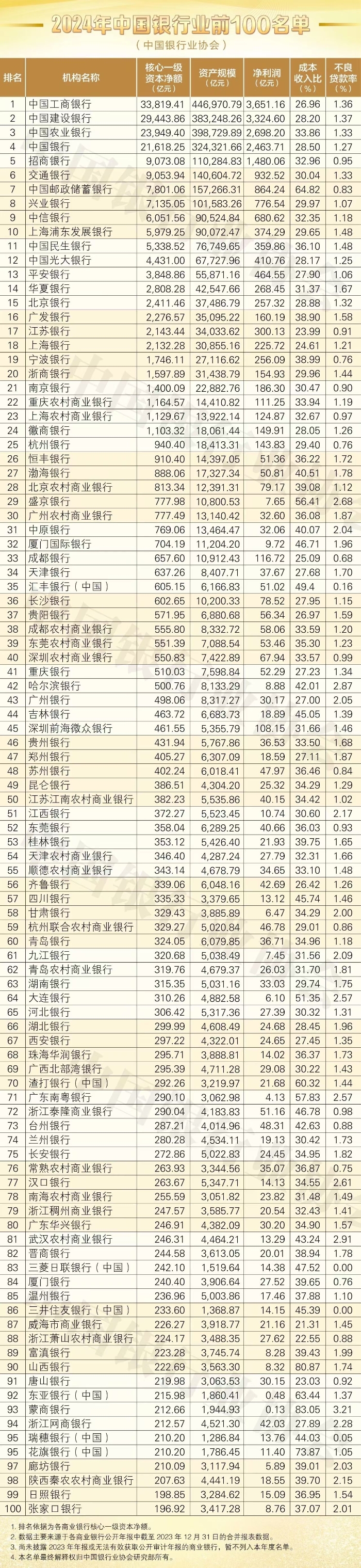 潮新闻讯 8月19日,中国银行业协会推出“2024年中国银行业前100强名单”,名单以2023年末国内商业银行核心一级资本净额为依据排序,综合展示前100家商业银行的经营规模、盈利能力、运营效率和资产质量等。