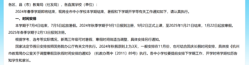 根据杭州市教育局发布的通知,2024年秋季学期于9月1日报到注册,9月2日正式上课。明年1月22日起放寒假。2025年春季学期于2月13日报到注册。