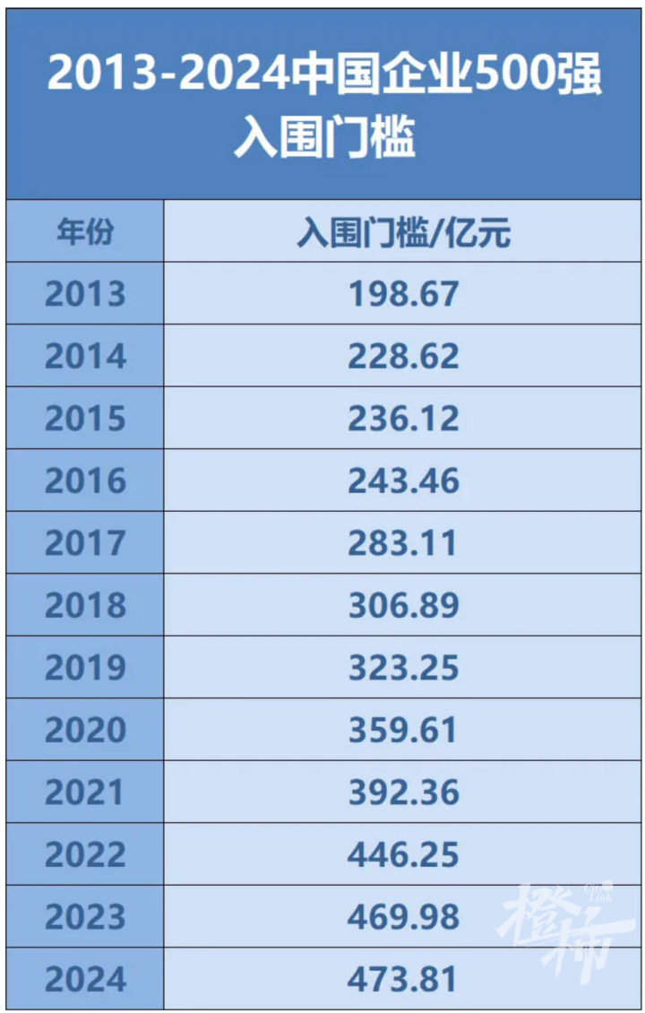 榜单显示,2024中国企业500强营业收入突破了110万亿元大关,达110.07万亿元,较上年增长1.58%。入围门槛实现22连升,达473.81亿元,提升3.83亿元。