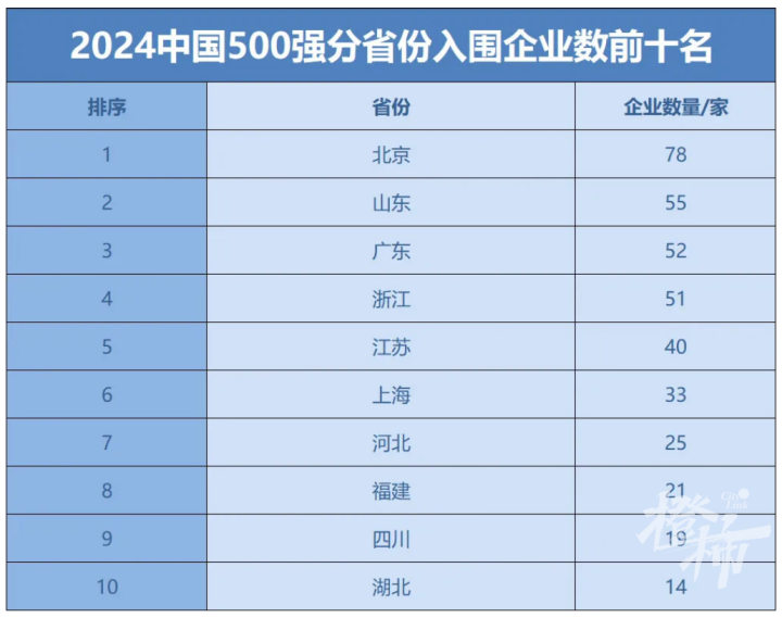 在地域分布上,2024中国企业500强共分布在30个省(自治区、直辖市)中,分布最多的五个地区依次是北京、山东、广东、浙江和江苏,入围数量分别为78、55、52、51、40个。