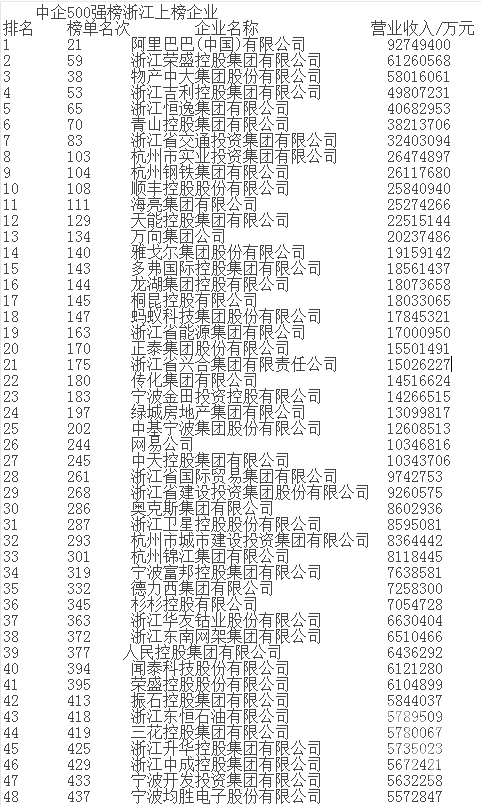 9月11日,中国企业联合会、中国企业家协会在天津召开2024中国500强企业高峰论坛,连续第23次向社会发布“中国企业500强”榜单。其中,有16家企业营业收入破万亿元,营业收入超过千亿元的企业数量为253家,占比超过50%。浙江有51家企业入围,比2022年增加5家企业。