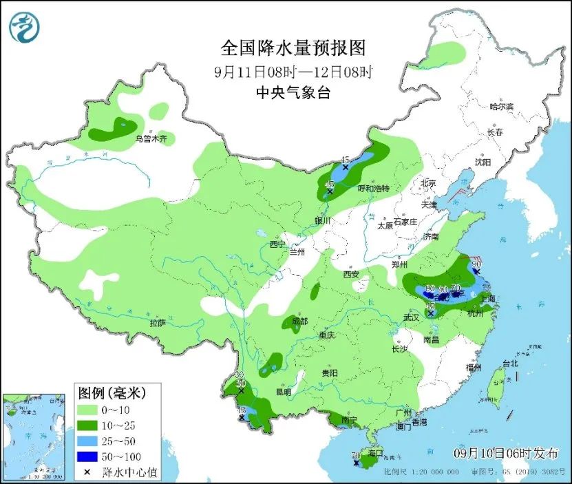 据中央气象台,预计未来三天,我国强降雨区将较为分散。其中今天,受“摩羯”残余云系影响,云南南部、广西西南部、海南岛等地仍有大到暴雨;11日至12日,上海、江苏、浙江、安徽等地部分地区有大到暴雨,局地大暴雨。降雨期间,请公众避免前往山区、河谷、水边等危险地带,警惕山洪、地质灾害、中小河流洪水等次生灾害。
