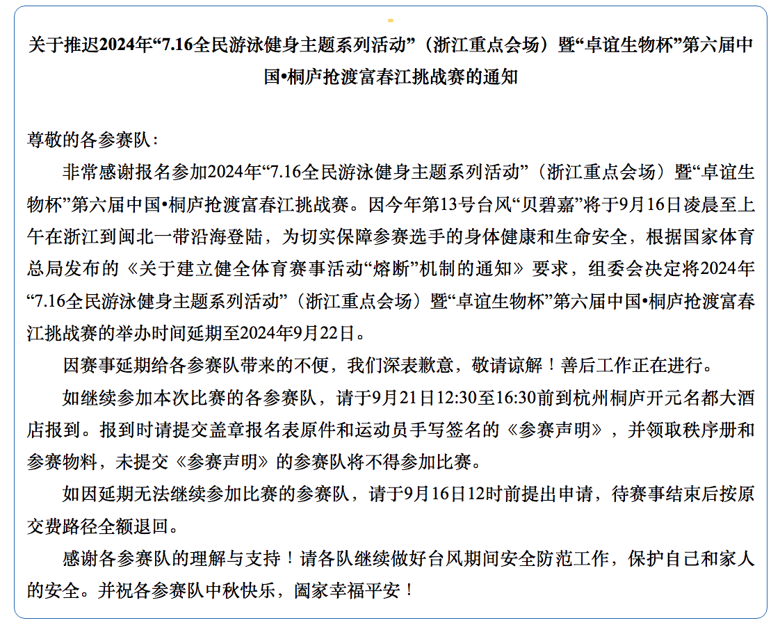 抢渡富春江挑战赛延期