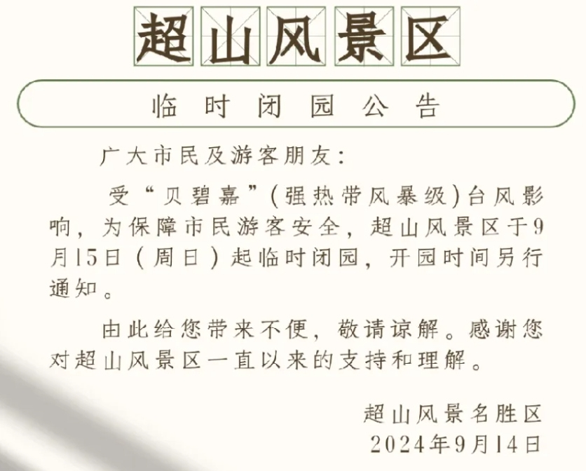 受今年第13号台风“贝碧嘉”影响,杭州部分景区已经发出闭园通知,请有出游安排的人提前查询。同时,一些室外比赛活动也因天气原因取消。