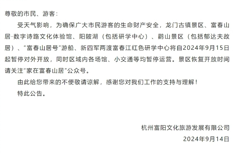 9月14日,杭州市钱塘区综合行政执法局发布《金沙湖音乐喷泉暂停喷放的公告》。