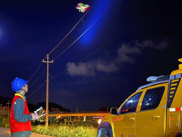 9月14日,国网乐清市供电公司员工在台风“贝碧嘉”来临前采用无人机对电力线路设备运行状态开展夜间特巡。通讯员 章静 摄